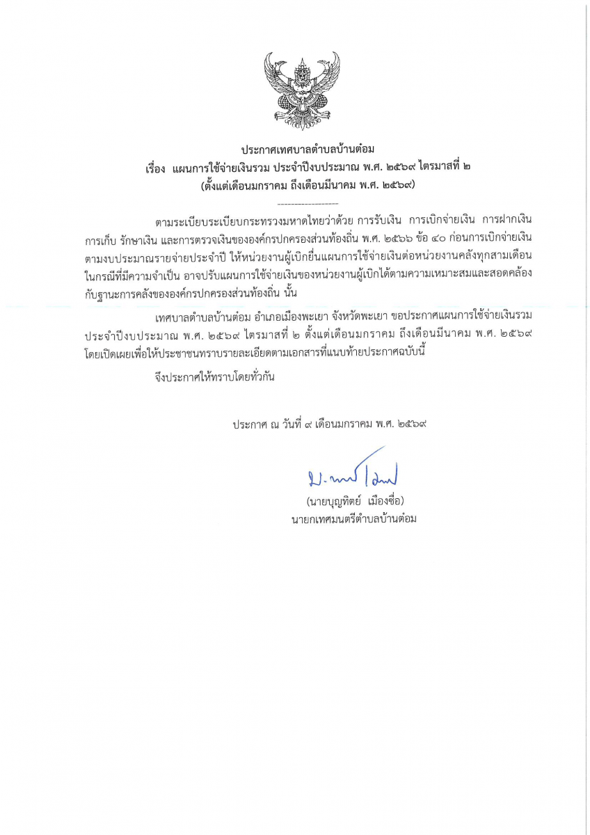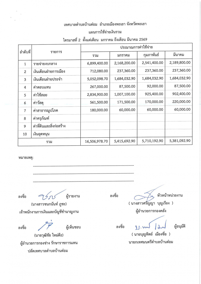 แผนการใช้จ่ายเงินรวม ประจำปีงบประมาณ พ.ศ.2569 ไตรมาสที่ 2